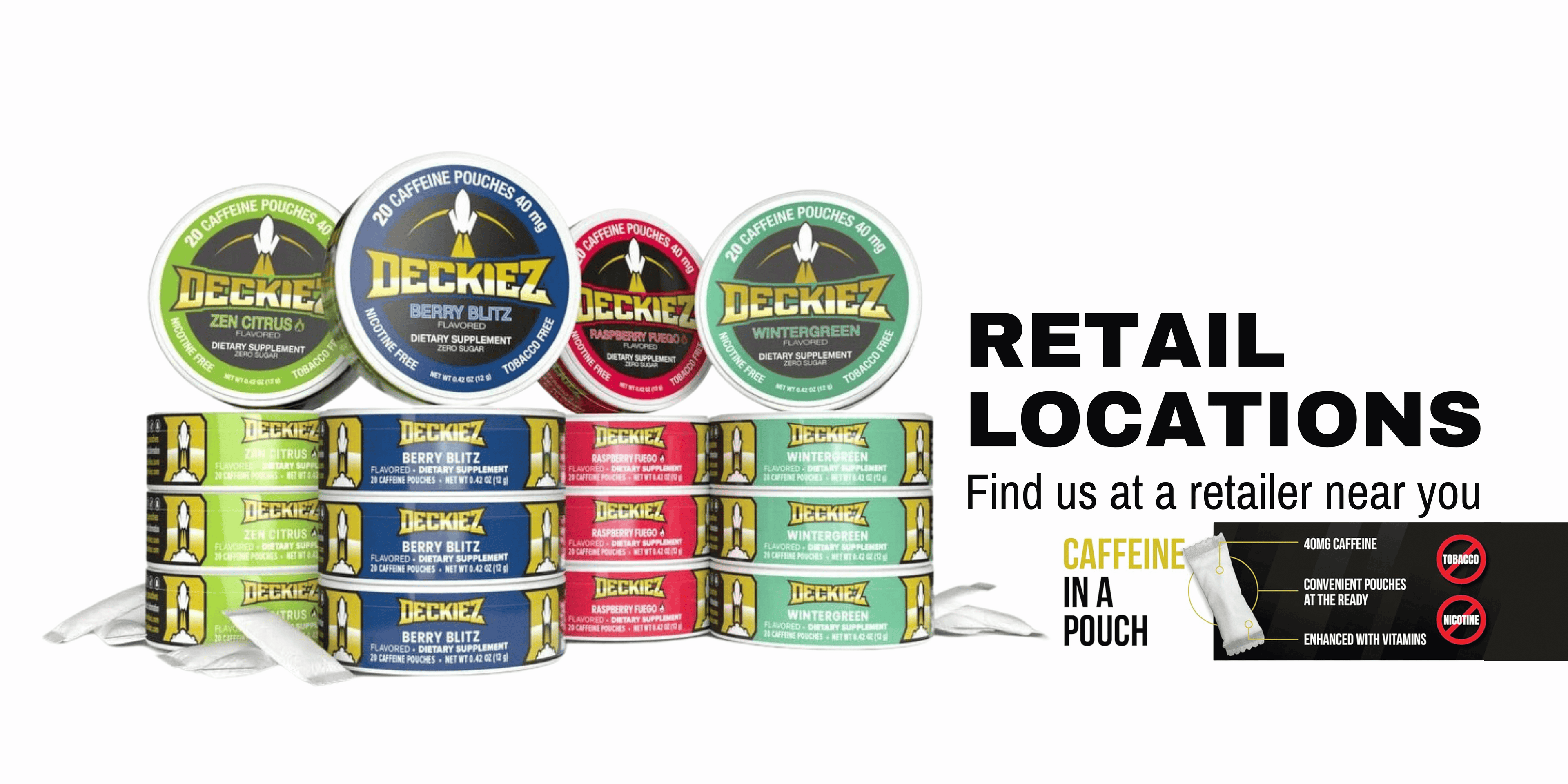 Are you a retailer who is interested in carrying Deckiez Caffeine Pouches products? We are always looking for new placement opportunities! Click the button below for more information.